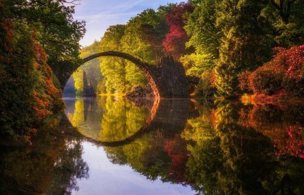 Rakotzbrücke hay còn được gọi là “Cầu Quỷ”, cây cầu vòm bắc ngang mặt hồ phẳng lặng trong công viên Kromlauer ở miền Đông nước Đức. Giữa khung cảnh mùa thu, khi cả khu rừng khoác lên mình sắc áo mới, nơi đây trở nên bí ẩn, lãng mạn hơn bao giờ hết.